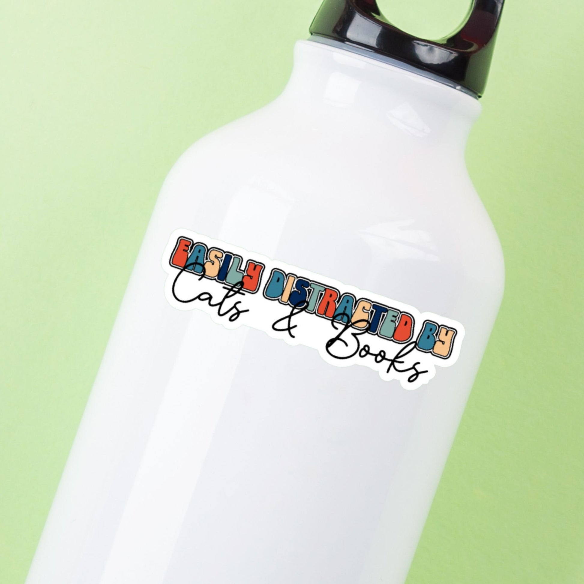 Easily Distracted By Cats & Books Sticker Attention all cat-loving bookworms! Our 'Easily Distracted By Cats & Books' vinyl sticker celebrates the enchanting combination of feline company and the captivating world of books. This water-resistant, die-cut sticker is perfect for personalizing laptops, book nooks, or any cozy reading space. Its delightful design beautifully combines the comfort of a purring companion with the allure of getting lost in a good book, making it a charming addition for those who adore both. Stick it anywhere you want to showcase your love for cats and your passion for literature!